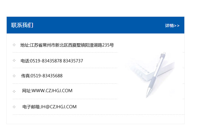 地址:常州市新北區(qū)友邦商務(wù)大廈1幢16、17層  電話:0519-85101652  傳真:0519-85112595  郵編:213022  網(wǎng)址:www.cz-jiayue_cn.nmgcaty.com  郵箱:xiajifengaa@163.com